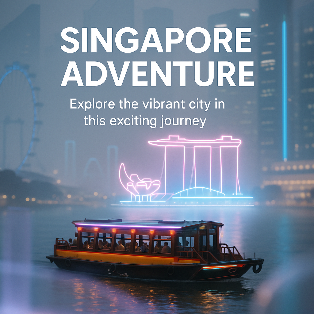 A visually striking promotional image showcasing a boat on water with a neon-lit cityscape of Singapore in the background, ideal for travel marketing.