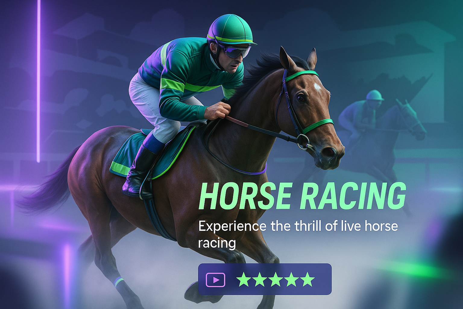 Vibrant promotional graphic showcasing the excitement of live horse racing, featuring a jockey in action with modern design elements and neon accents, ideal for event marketing.