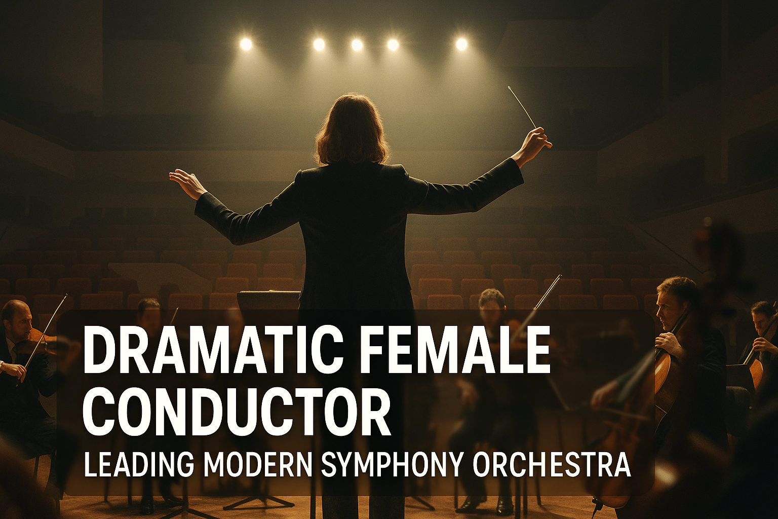 /Collection: /by davooda/Type: PNG/A captivating image of a female conductor leading a modern symphony orchestra, featuring dramatic lighting and a strong focus on the conductor's expressive gestures. Ideal for music and arts-related uses.