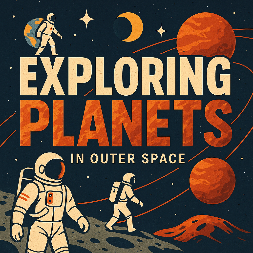 /Collection: /by davooda/Type: PNG/Vibrant illustration depicting astronauts exploring planets in outer space, featuring a retro design style ideal for educational or promotional materials related to astronomy.