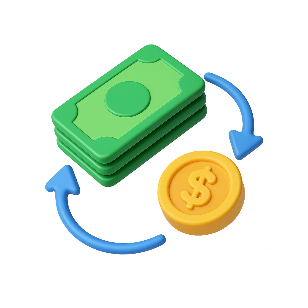 A colorful 3D icon representing money exchange, featuring a stack of green bills and a yellow coin with a dollar sign, set against a soft gradient background.