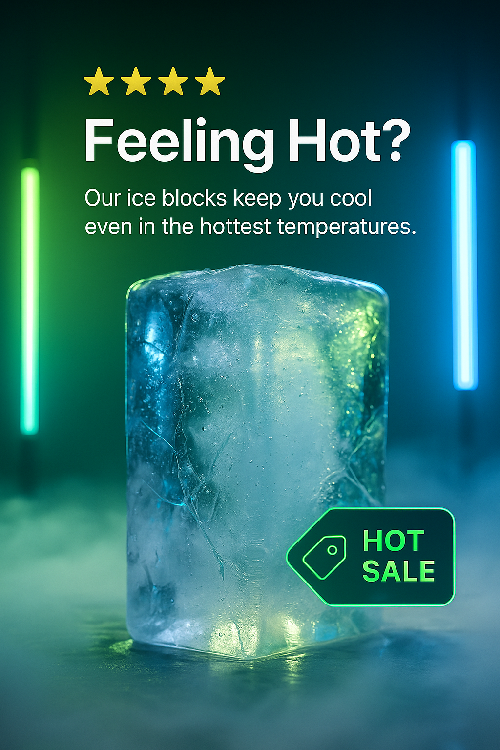 A vibrant carousel slide featuring a glowing ice block amidst neon lights. The design showcases a bold headline, rating stars, and a 'Hot Sale' tag, all set in a misty background.