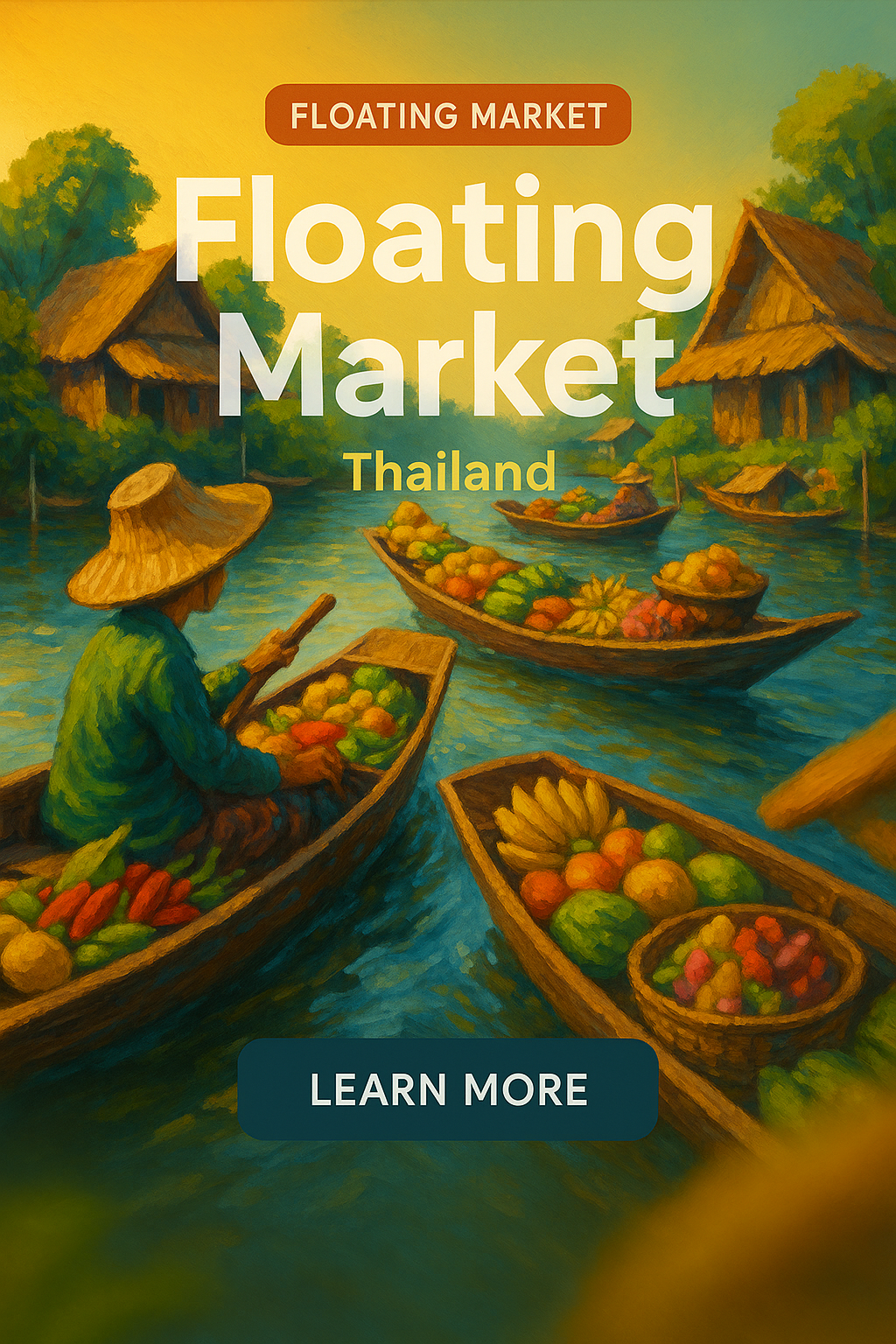 /Collection: /by davooda/Type: PNG/Artistic illustration depicting a traditional Thai floating market, showcasing boats filled with colorful fruits and a vendor. Suitable for travel promotions or cultural showcases.