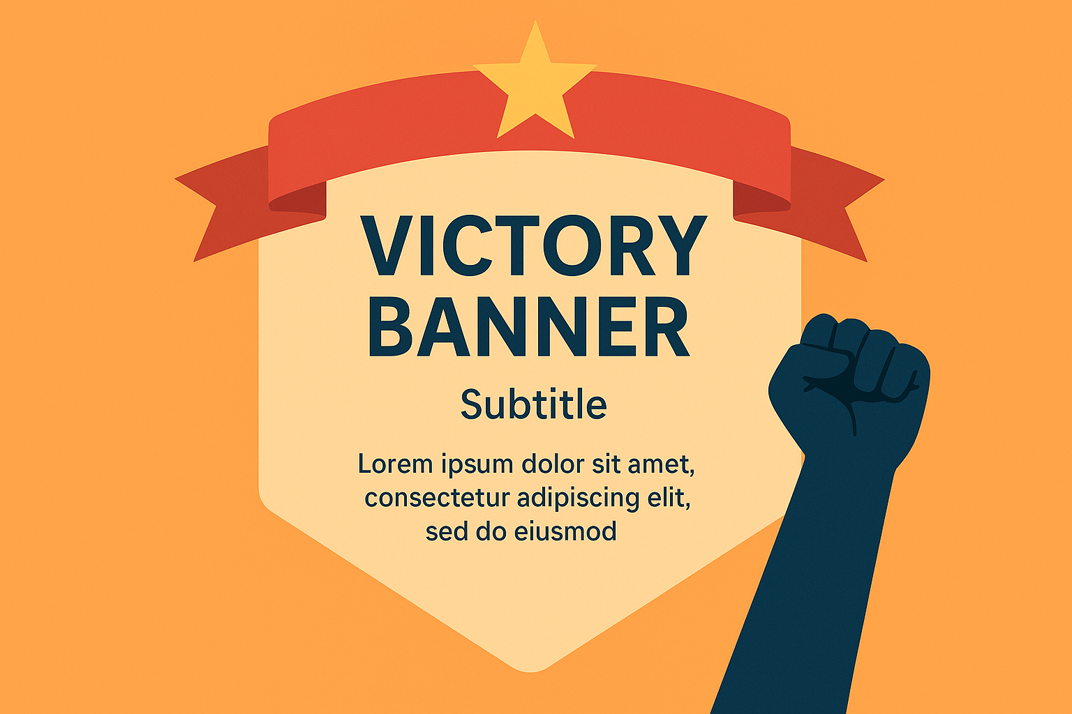 A vibrant victory banner featuring a bold title and subtitle, complemented by a raised fist symbol. The design includes a simple gradient background and a balanced composition with a three-color scheme.