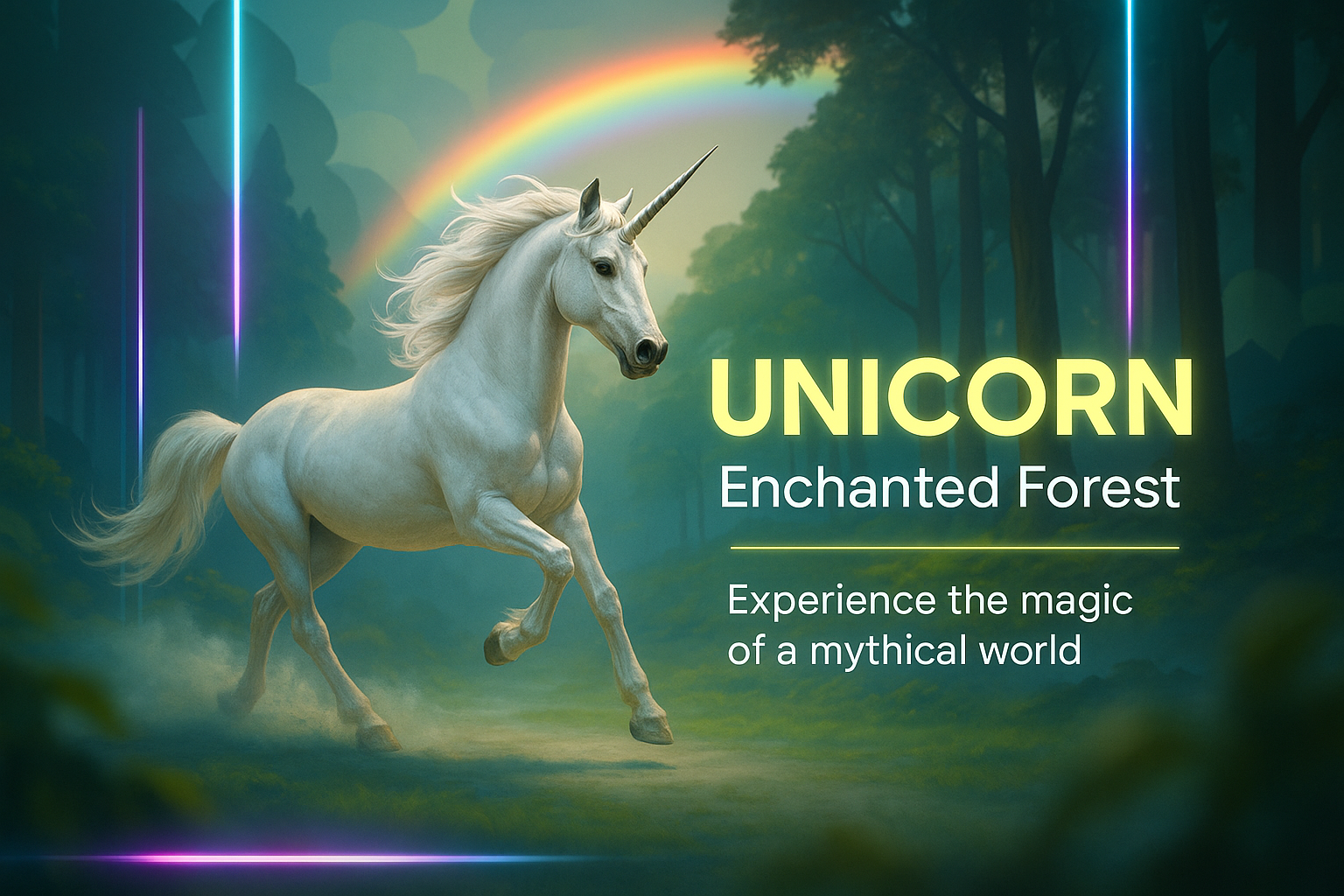 /Collection: /by davooda/Type: PNG/Vivid fantasy artwork depicting a unicorn in a lush, enchanted forest, enhanced by ethereal lighting and a rainbow. Perfect for promoting fantasy-themed events or products.