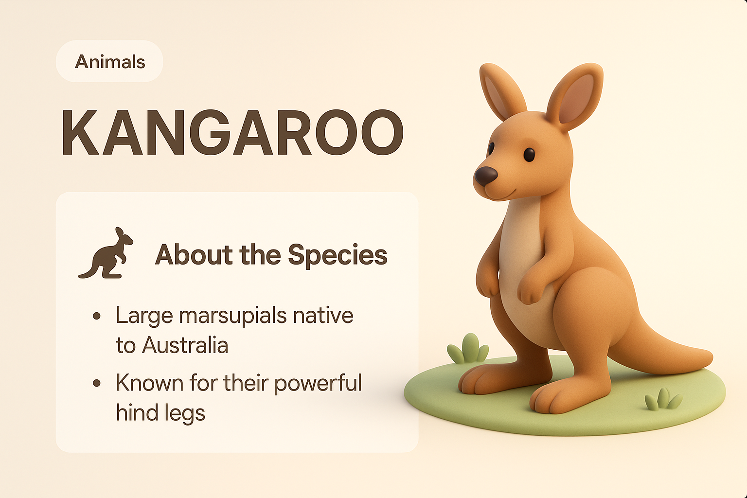 /Collection: /by davooda/Type: PNG/This image features a 3D kangaroo illustration set against a smooth gradient background. Accompanying text provides insights about the species, highlighting their natural habitat and characteristics.