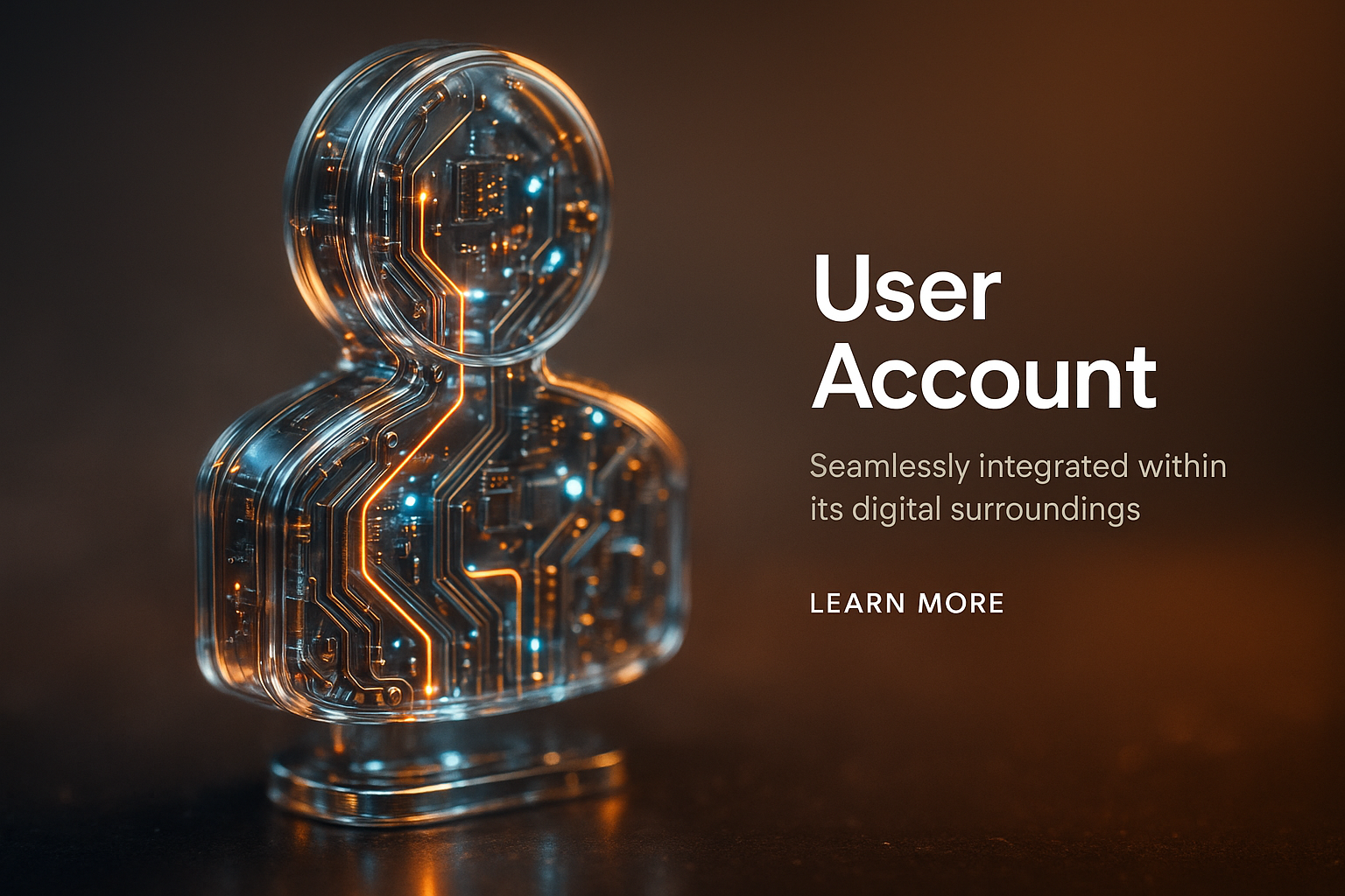 A hyperrealistic 3D scene showcasing a glass-like user account figure with glowing micro-LEDs and intricate circuit designs, illuminated by neon lights against a gradient background.