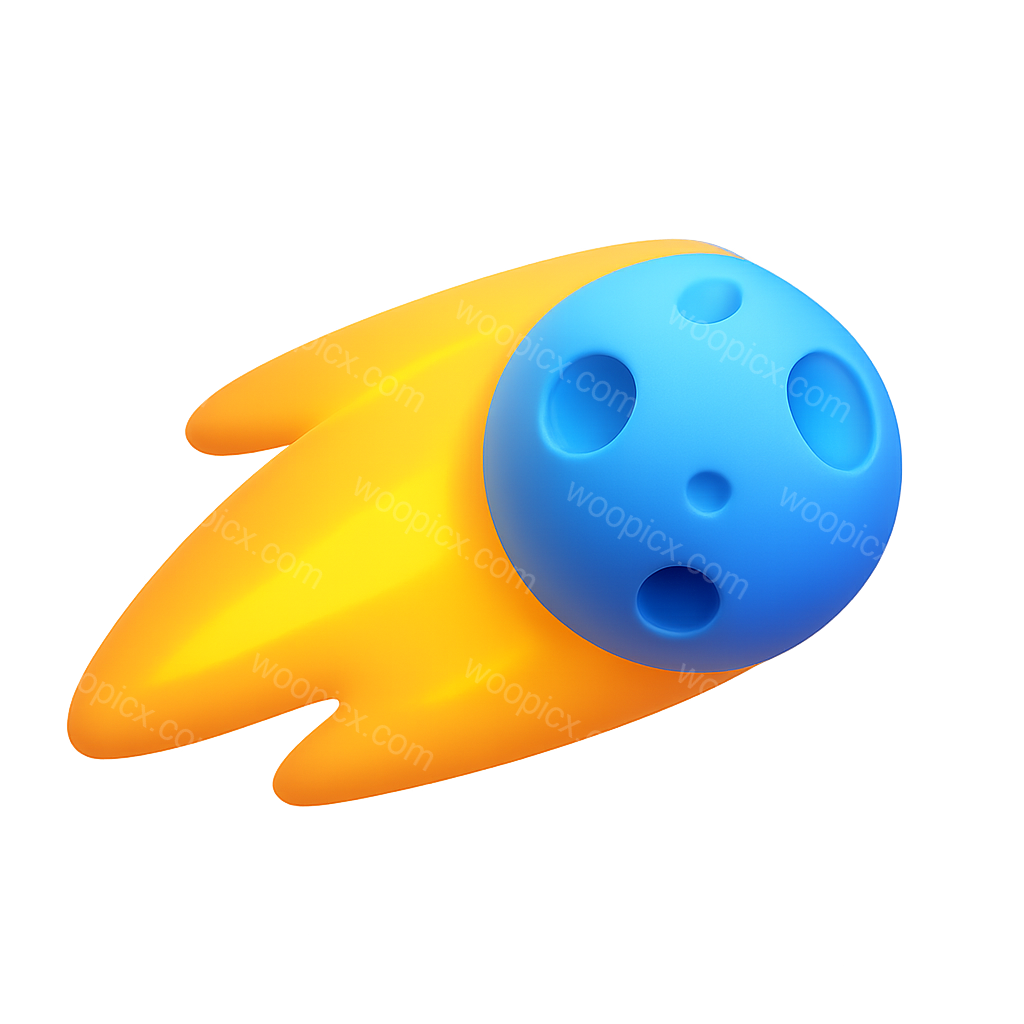 A stylized 3D icon of a comet featuring a glowing yellow tail and a blue spherical head with crater-like details. The image showcases a three-quarter view with a transparent background.
