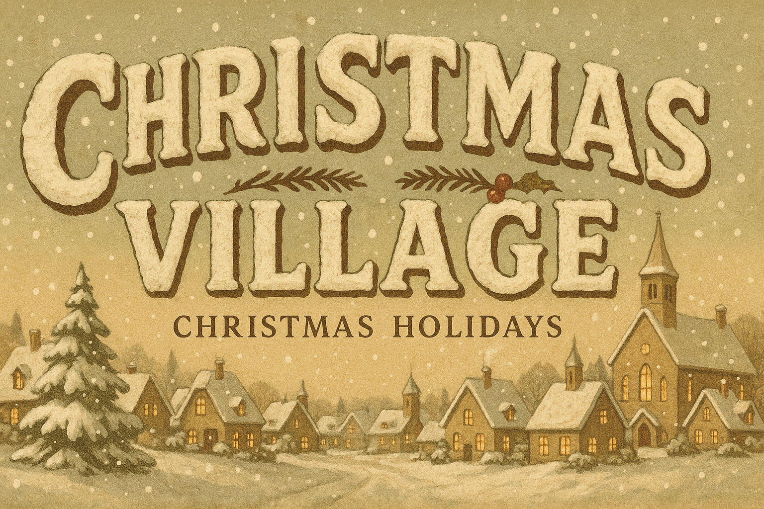 Charming holiday-themed illustration depicting a snow-covered village with vintage typography. Ideal for seasonal decorations or greeting cards.