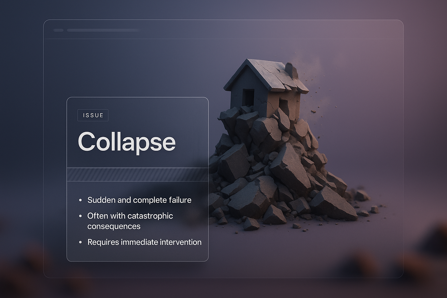 /Collection: /by davooda/Type: PNG/A visually striking 3D illustration representing the concept of collapse, featuring a house amidst a pile of rocks. The design incorporates a dark translucent panel with informative text.