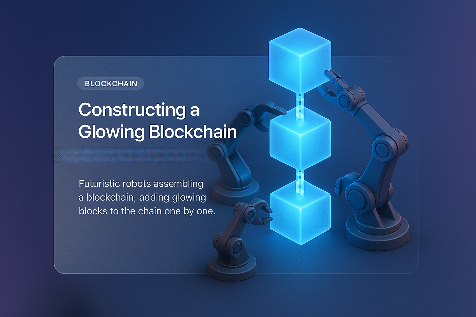 A captivating 3D illustration of futuristic robots constructing a glowing blockchain, block by block, against a smooth gradient background.