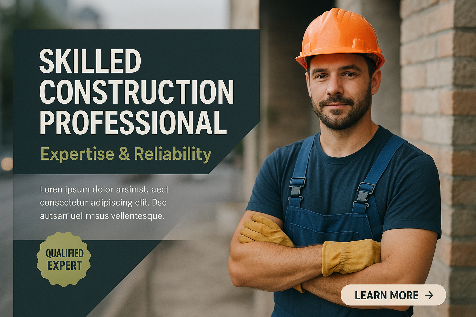 /Collection: /by davooda/Type: PNG/A realistic portrait of a construction professional wearing an orange hard hat and gloves, with a focus on expertise and reliability. The design features layered elements and a clean layout.