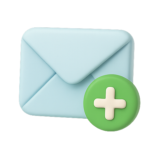 A modern and playful email icon featuring a light blue envelope alongside a green circular add button, suitable for digital applications and interface design.