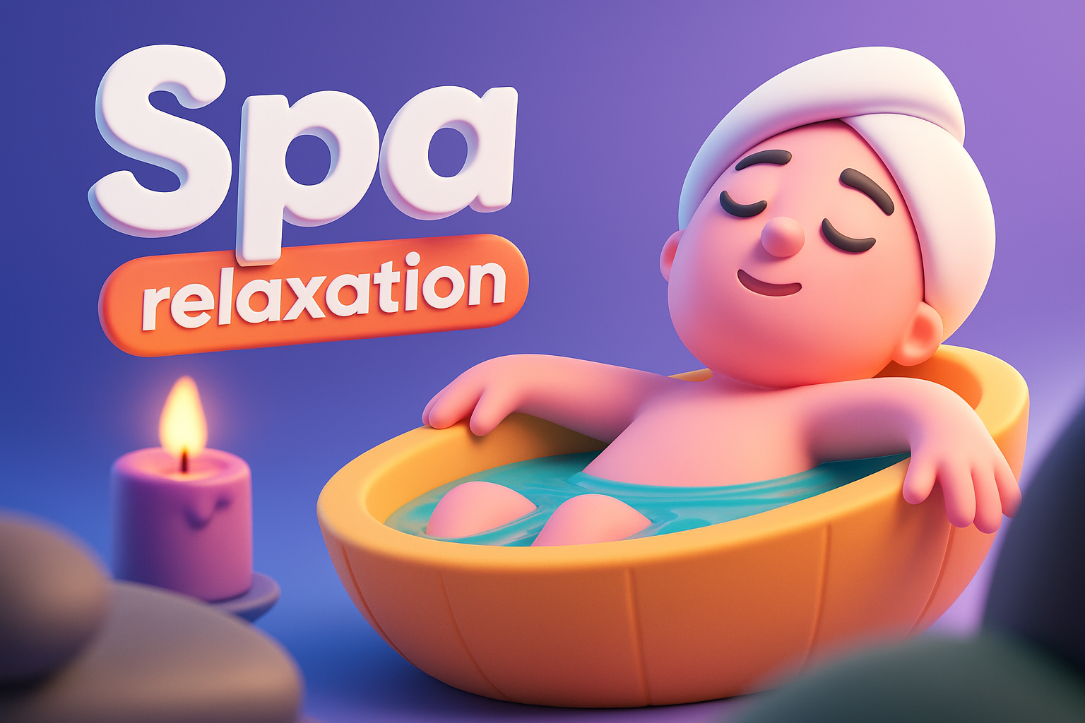 /Collection: /by davooda/Type: PNG/A vibrant 3D illustration showcasing a relaxing spa scene, featuring a character in a bath. The design incorporates a calming gradient background, soft candlelight, and smooth curves to enhance the tranquil atmosphere.