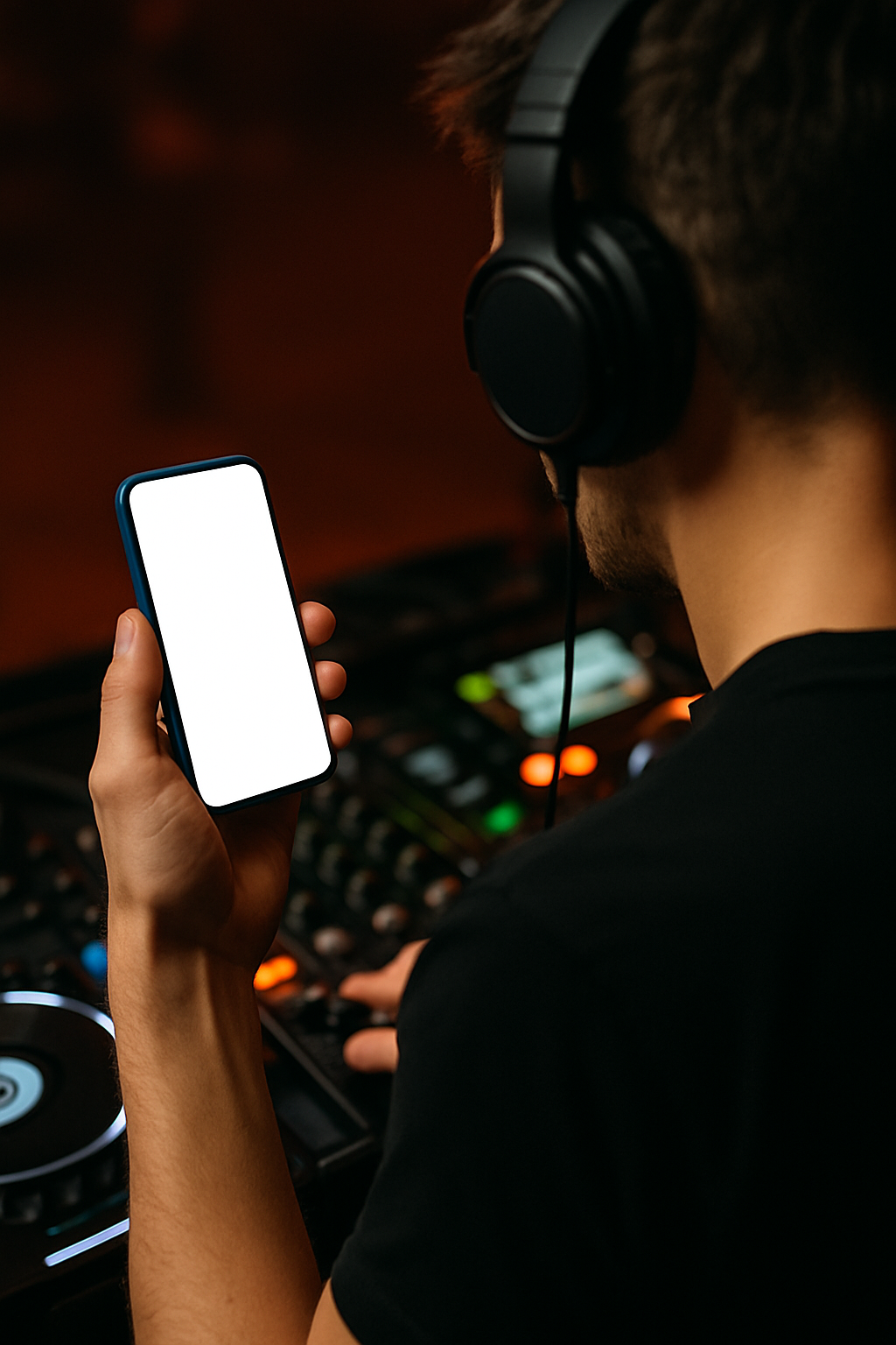 A dynamic shot of a DJ wearing headphones, holding a blue phone with a blank screen near a mixing deck. The focus is on the phone and the DJ's hands, showcasing a behind-the-shoulder perspective.