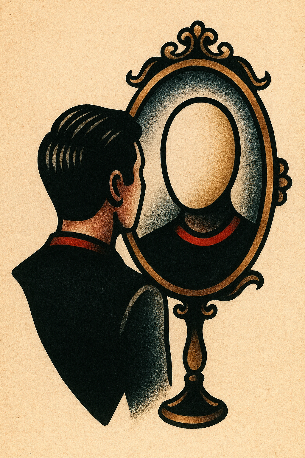/Collection: /by davooda/Type: PNG/A striking tattoo design featuring a man gazing into a mirror that reflects a faceless silhouette. The artwork is rendered in vibrant colors on a soft beige background.