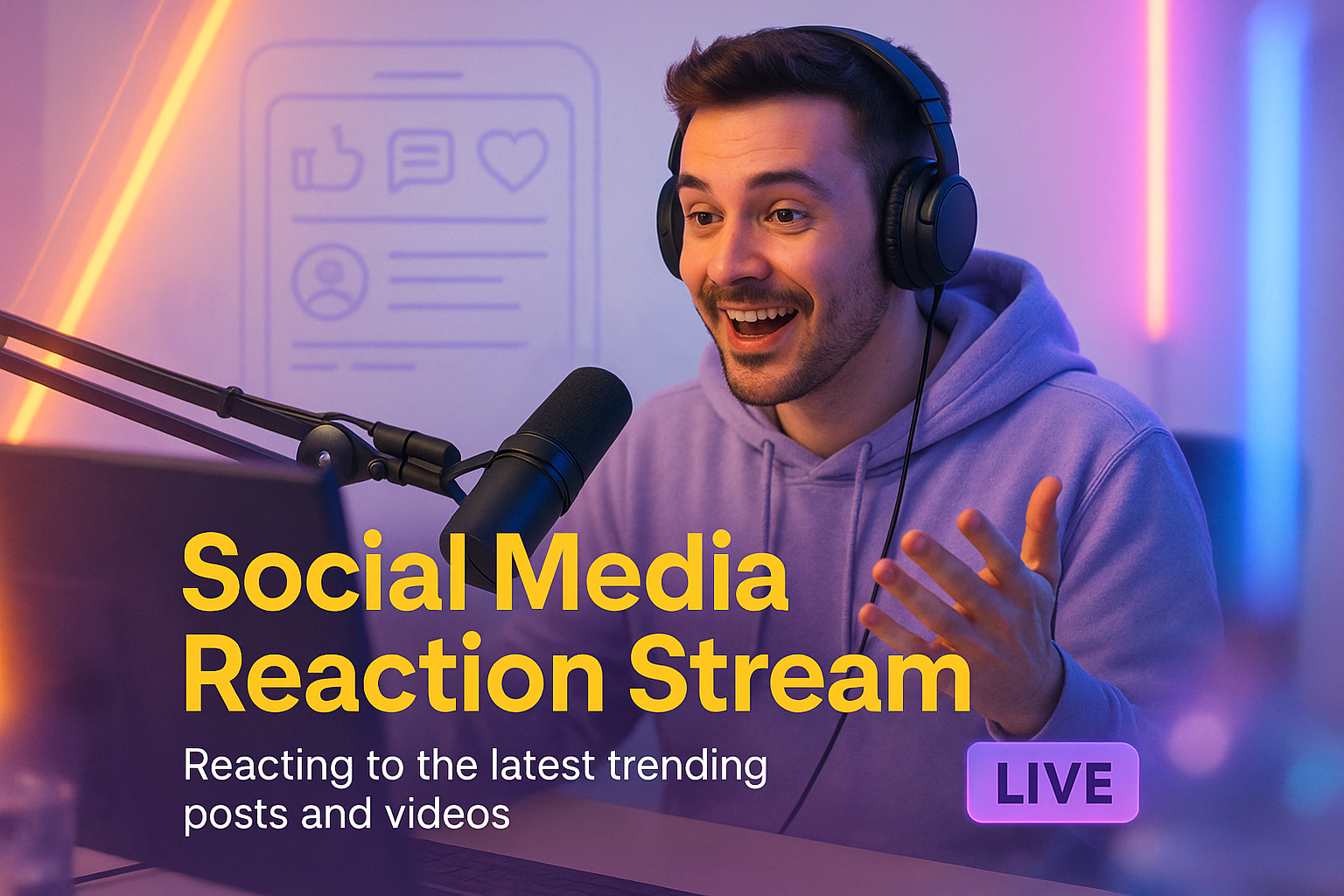 Vibrant promotional graphic for a live social media reaction stream featuring a content creator engaging with trending topics, ideal for streaming platforms.