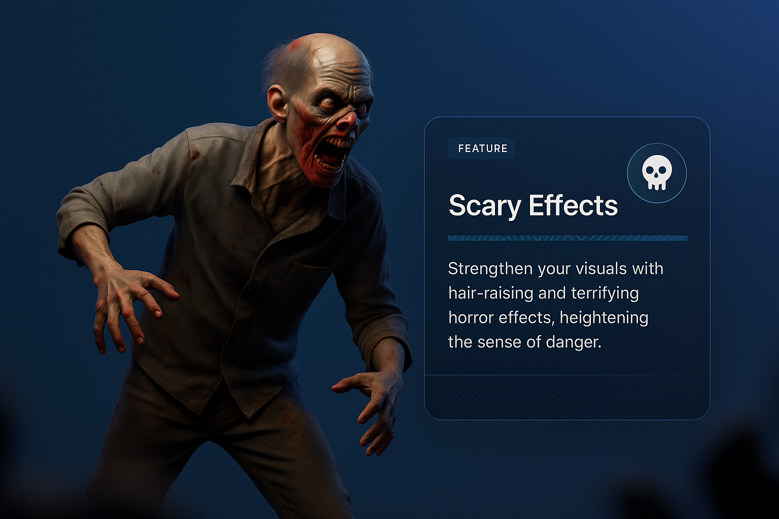 A terrifying 3D zombie is depicted against a dark gradient background, accompanied by a feature block highlighting scary effects. The zombie's menacing expression enhances the horror theme.