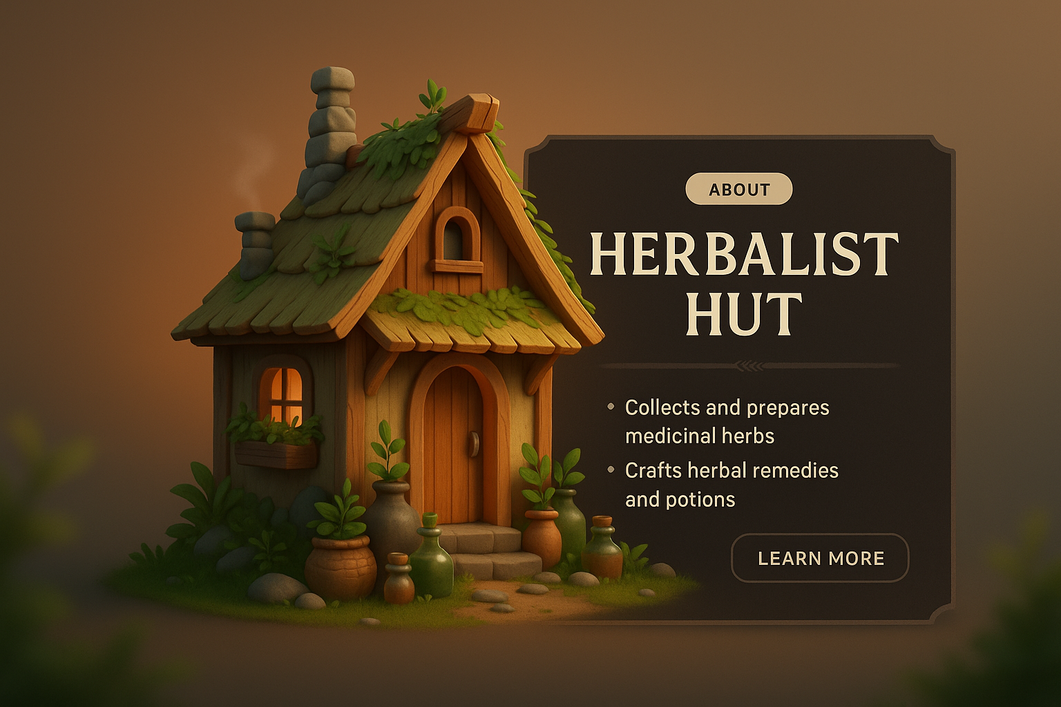 A beautifully rendered 3D illustration of a herbalist hut surrounded by nature. The image includes a dark informational panel with text about herbal remedies.
