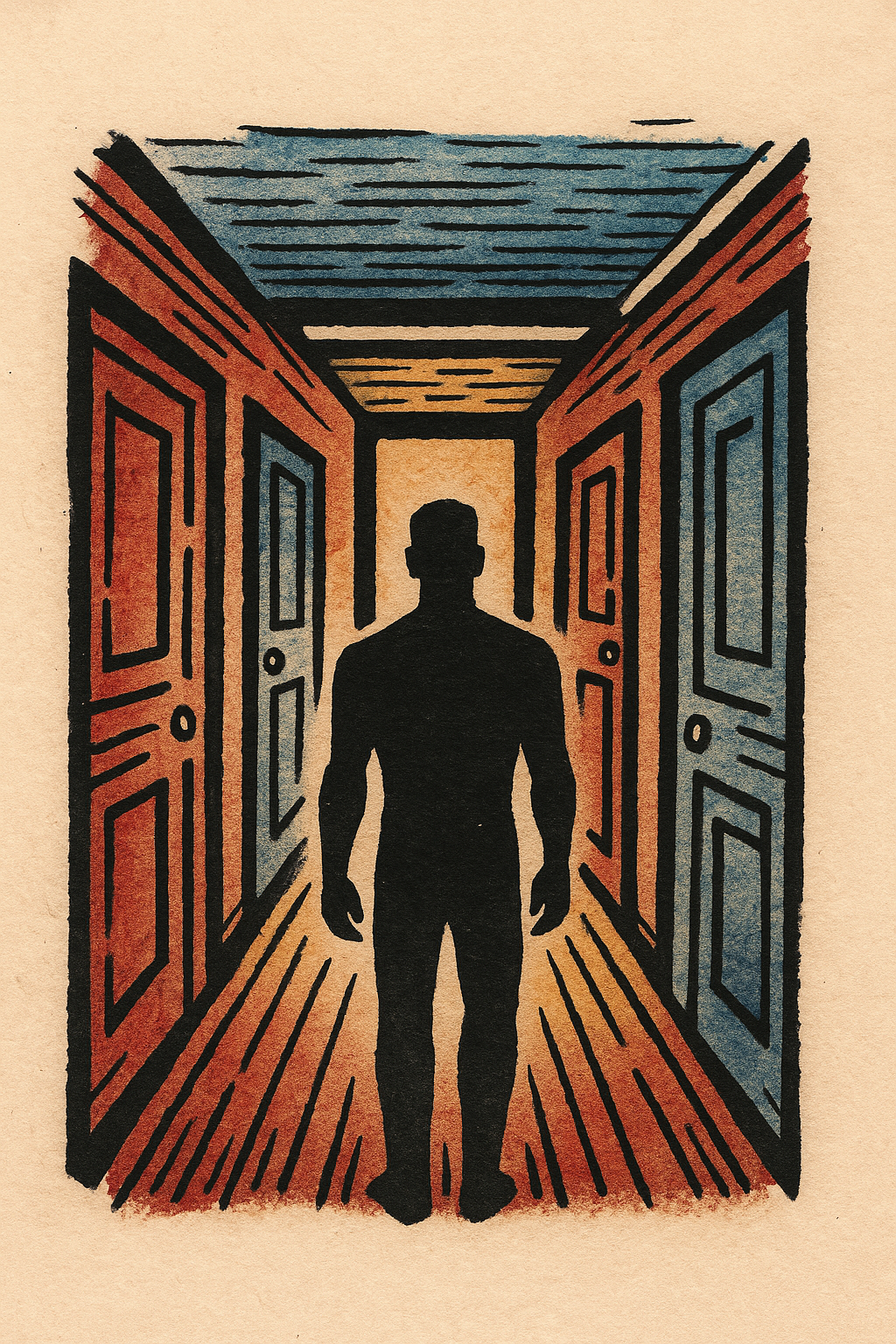 /Collection: /by davooda/Type: PNG/A striking silhouette of a figure stands in a corridor flanked by multiple colorful doors. The artwork features a classic tattoo style with a warm beige background.