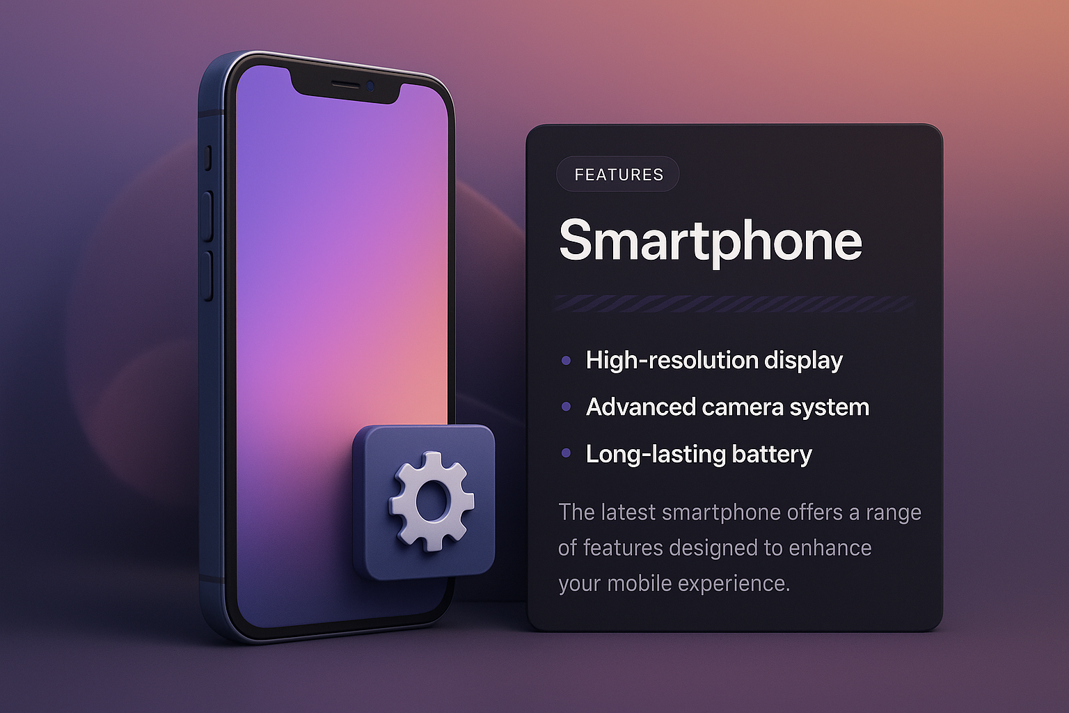 The image showcases a sleek smartphone against a gradient background. Accompanying text highlights key features like high-resolution display and advanced camera system, all presented in a stylish design.