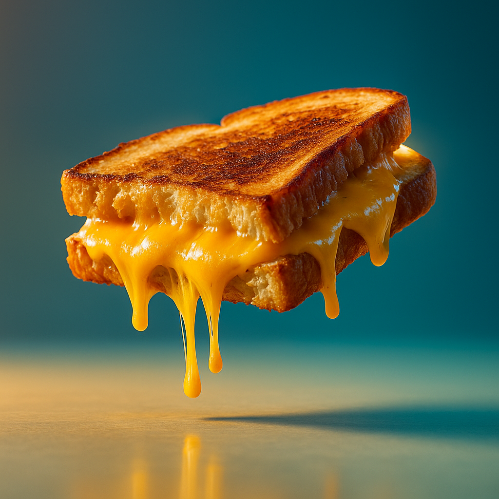 /Collection: /by davooda/Type: PNG/A beautifully captured grilled cheese sandwich, floating with melted cheese oozing from its layers. The scene is dynamically lit with contrasting colors, set against a smooth gradient background that enhances its realism.