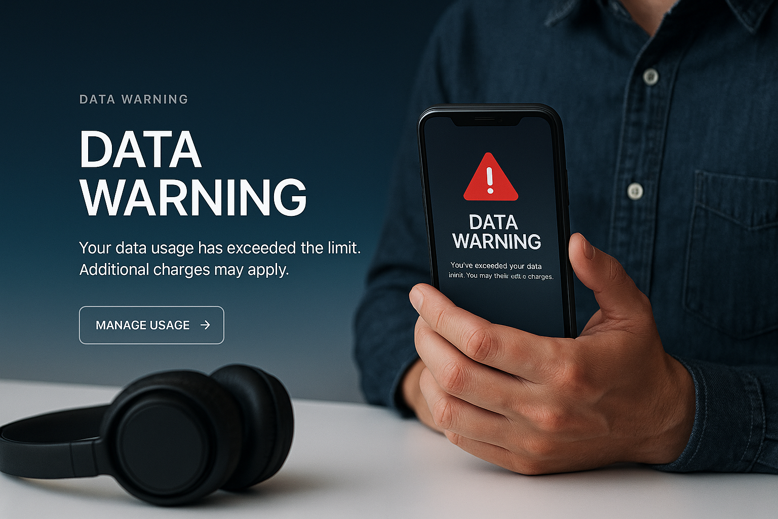 A modern web page design featuring a data warning message displayed on a smartphone. The background has a dark gradient, enhancing the visual appeal.