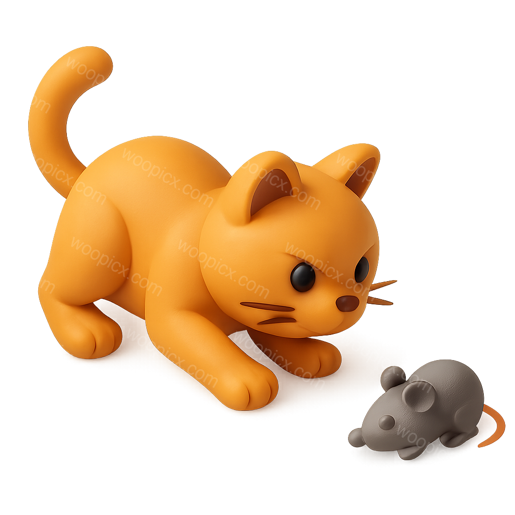 A playful 3D rendering of an orange cat in a hunting pose, with a small gray mouse in front. The cat's expression is focused, showcasing a three-quarter isometric perspective with a soft, volumetric style.