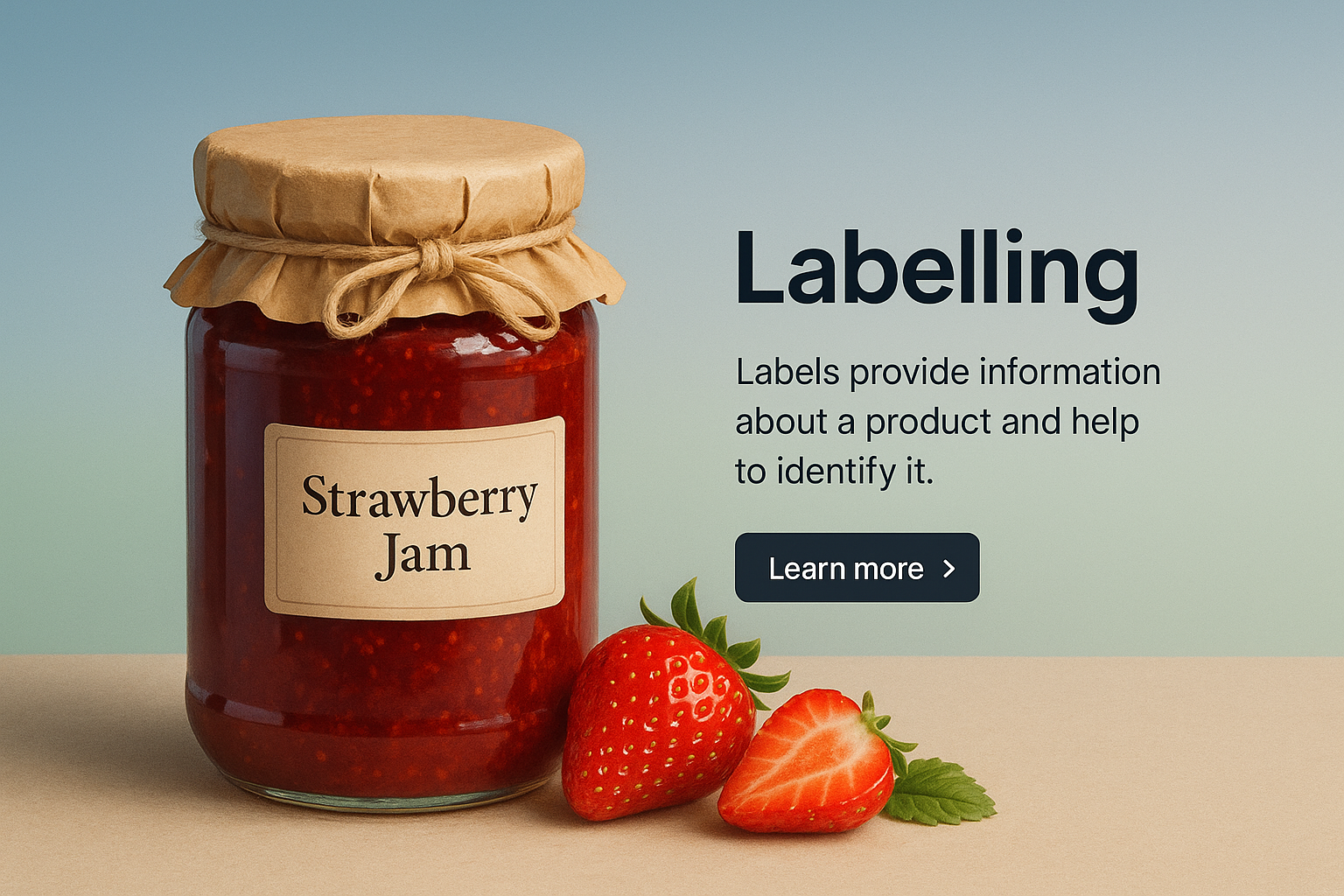 A stylish product label design featuring a jar of strawberry jam, complemented by fresh strawberries. The layout includes a clear title and informative text, enhancing readability.