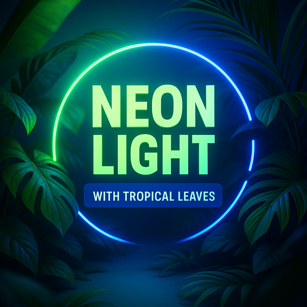 A visually striking graphic featuring neon light effects surrounded by tropical foliage. Ideal for modern designs, social media posts, or promotional materials.
