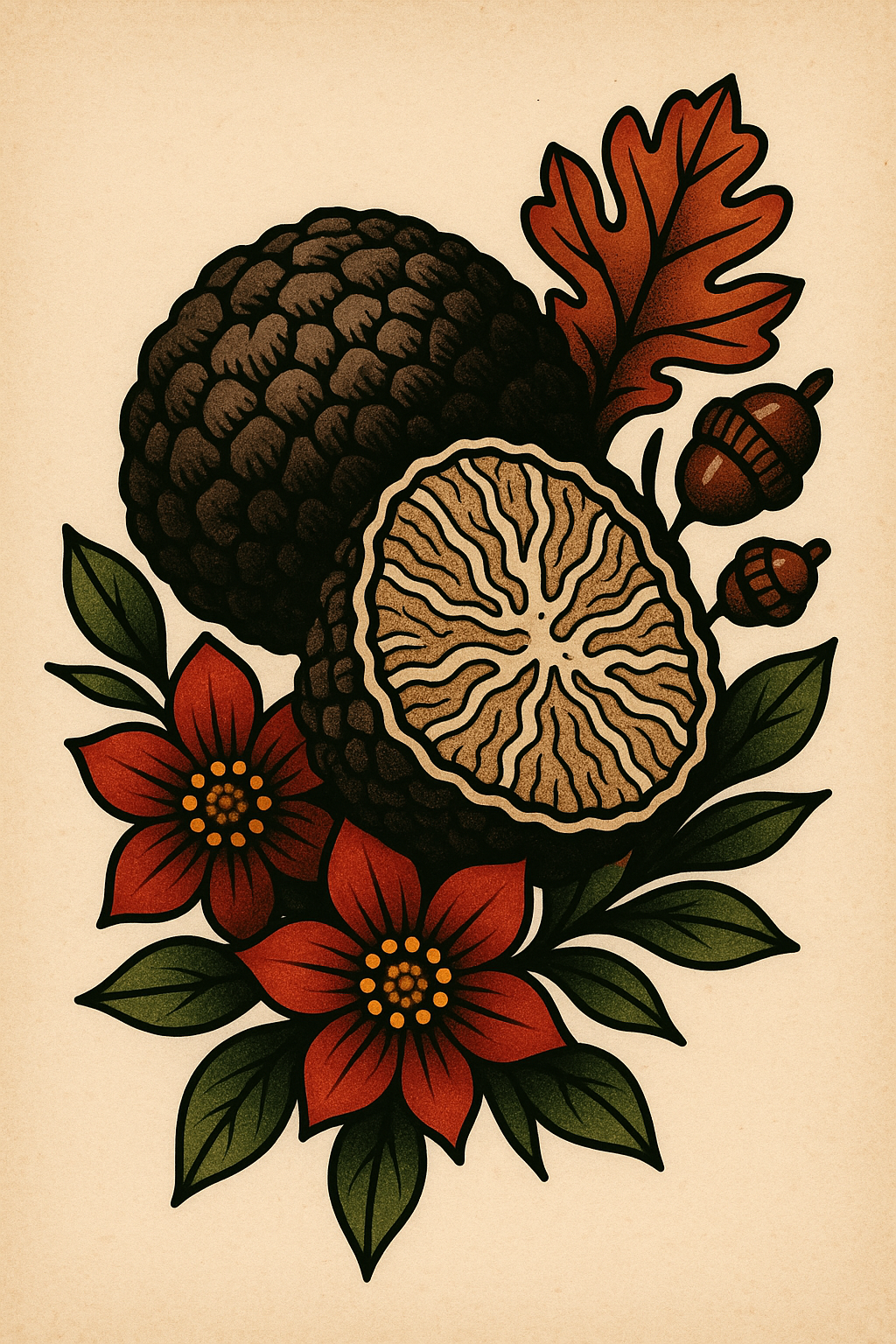 /Collection: /by davooda/Type: PNG/A vibrant illustration featuring stylized autumn elements, including flowers, acorns, and textured nuts. Ideal for seasonal decor or product branding.