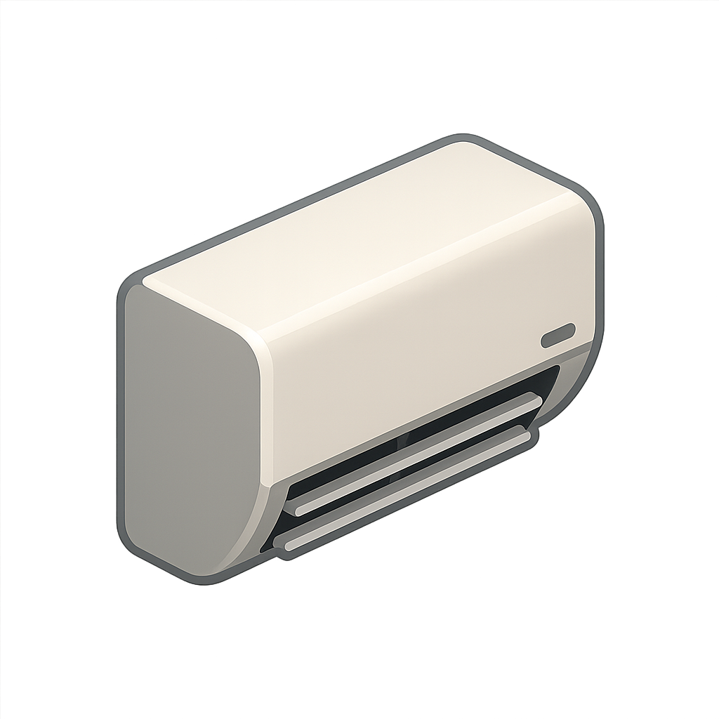 A sleek 3D icon of an air conditioner depicted in a three-quarter isometric view. The design features smooth contours and a minimalist aesthetic, set against a subtle gradient background.