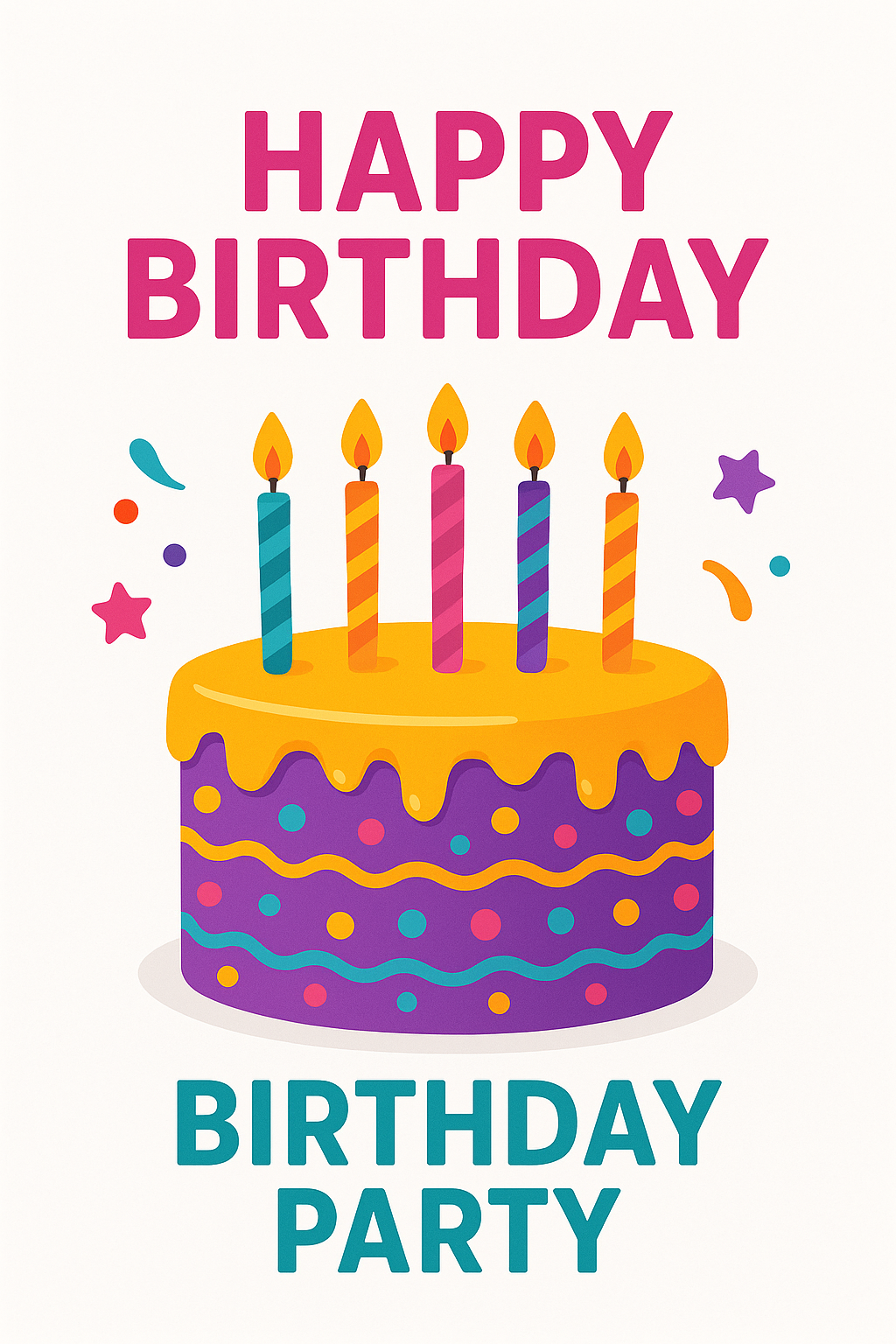 Vibrant birthday celebration graphic featuring a decorated cake with candles and playful design elements, ideal for party invitations or social media posts.