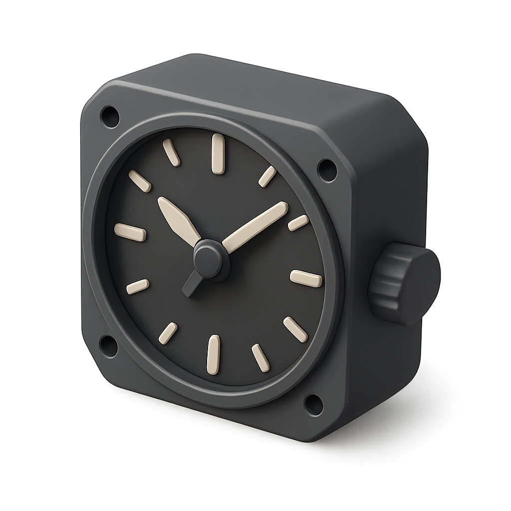 A sleek 3D icon of an altimeter viewed from a three-quarter angle, featuring a dark casing and distinct hour and minute hands. The design is volumetric and isometric, perfect for digital applications.