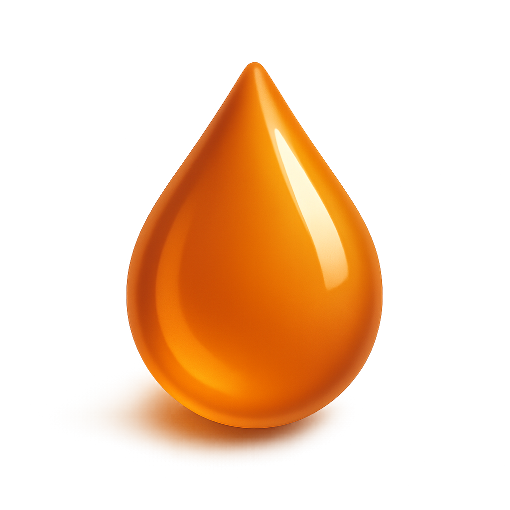 A sleek, 3D amber droplet icon rendered in a three-quarter view, showcasing a glossy surface and a transparent background, enhancing its volumetric appearance.