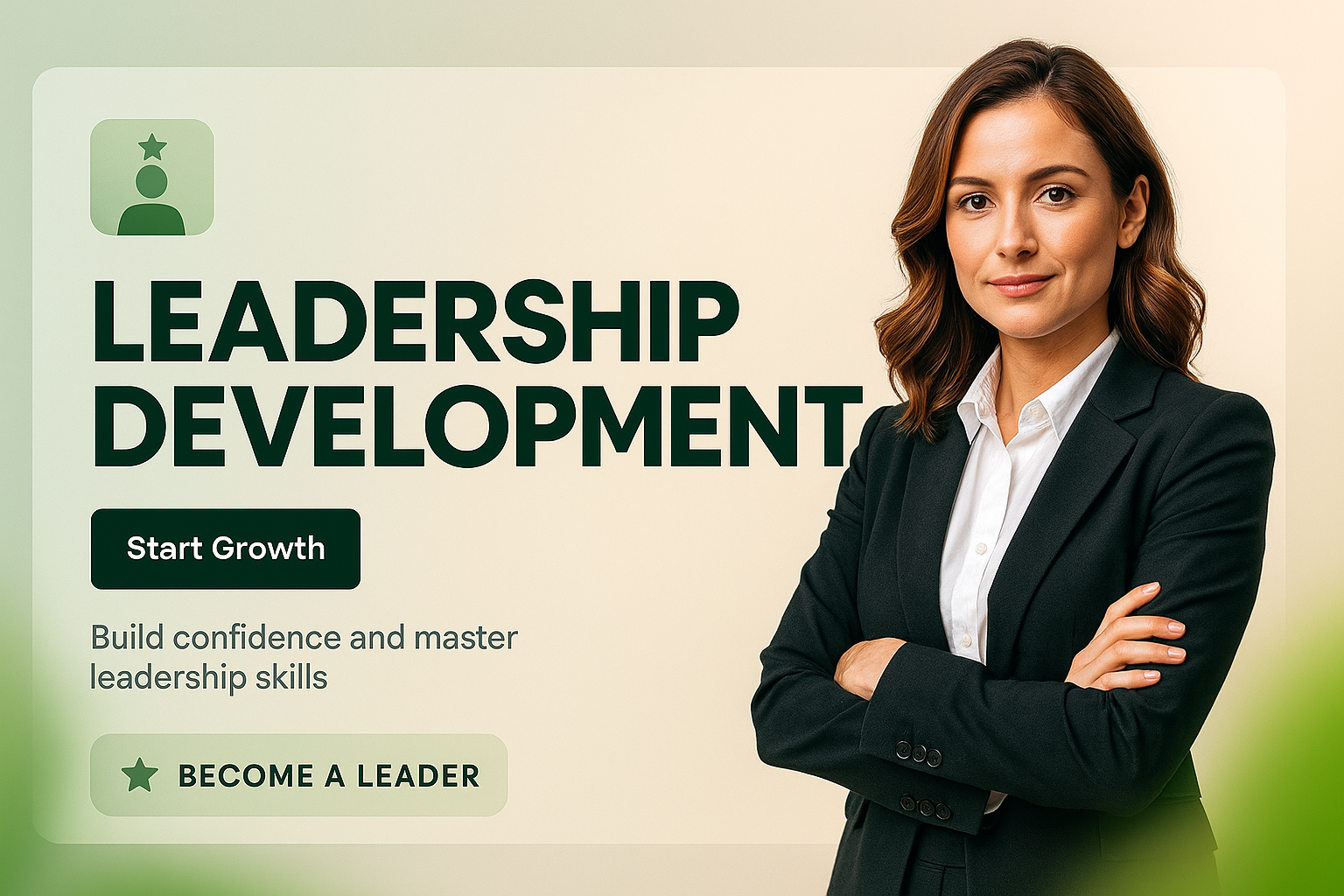 /Collection: /by davooda/Type: PNG/A professional portrait of a confident businesswoman in a suit, arms crossed, set against a smooth gradient background. The design features elements for leadership development, including engaging text and icons.