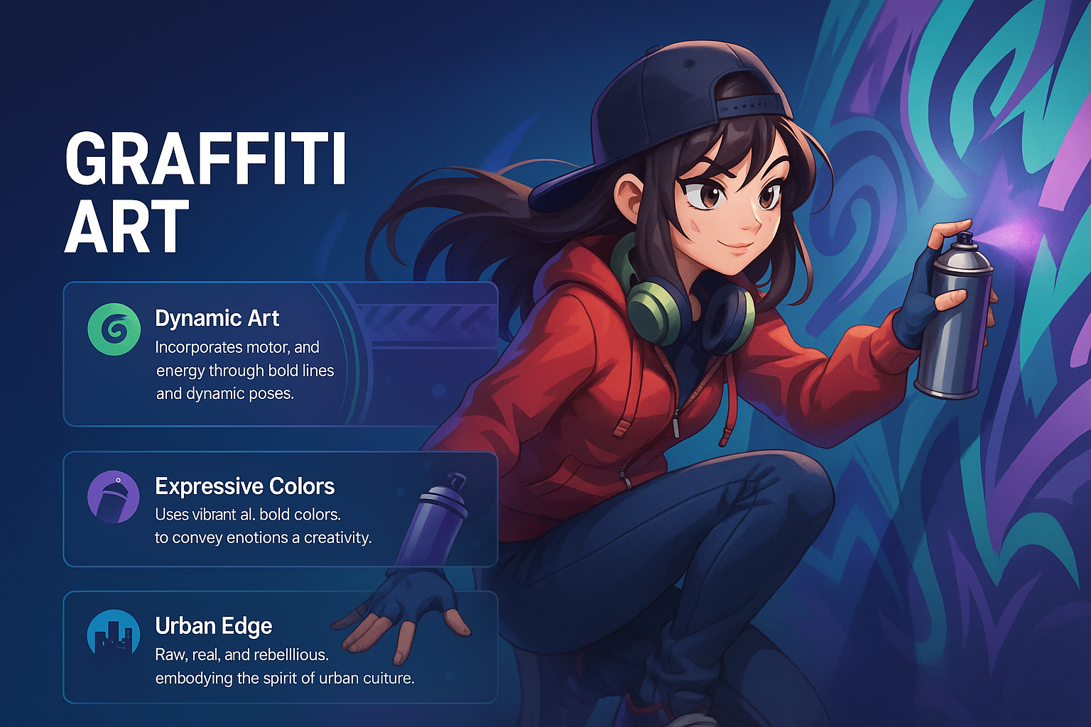 A vibrant anime girl artist spray painting graffiti on a colorful wall. The image features bold colors and dynamic poses, capturing the essence of urban art.