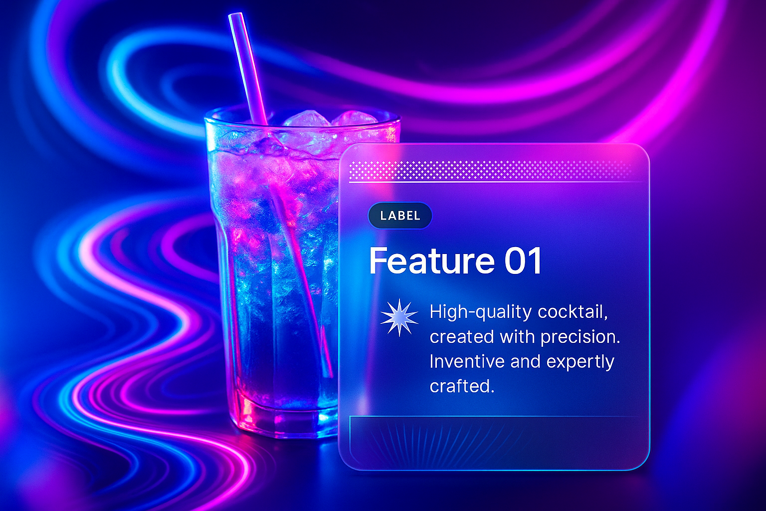 A stunning glass of cocktail illuminated by vibrant neon lights, set against a colorful background. The design features a modern label highlighting the drink's quality.