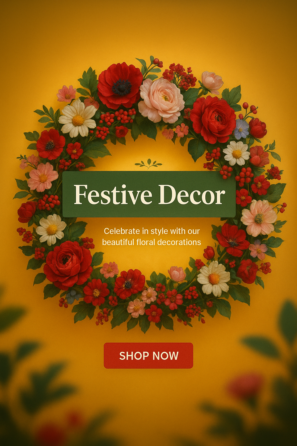 /Collection: /by davooda/Type: PNG/A promotional graphic featuring a vibrant floral wreath against a yellow background, ideal for advertising seasonal decorations. It combines a cheerful aesthetic with a clear call to action.