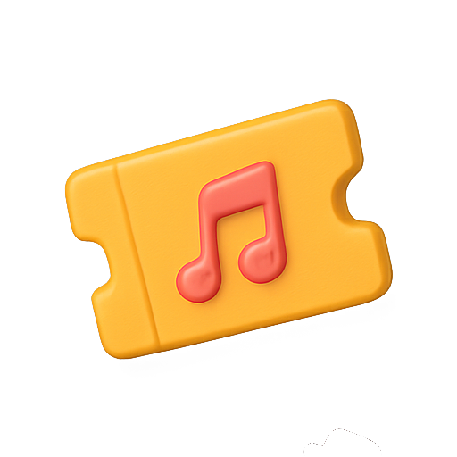 A vibrant, stylized icon representing a music ticket, featuring a musical note design. Ideal for music-related applications or events.