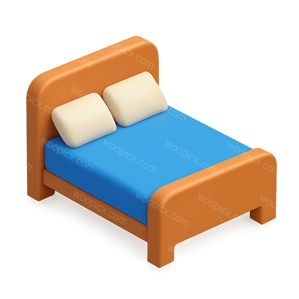 /Premium/Collection: /by davooda/Type: PNG/A visually appealing 3D bed icon featuring a blue mattress and white pillows. The design showcases a modern aesthetic with a three-quarter view and volumetric feel, set against a gradient background.
