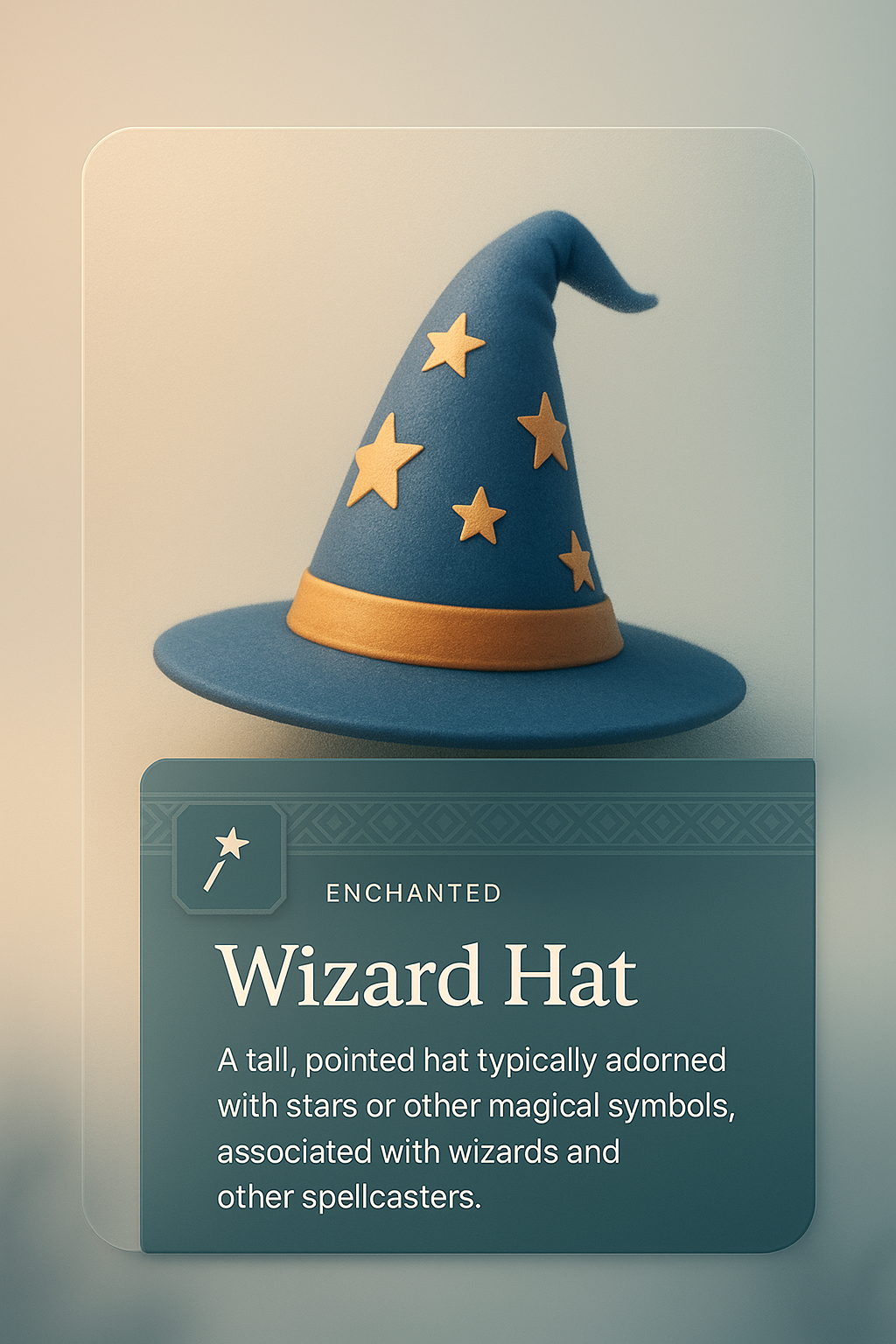 A tall, pointed wizard hat featuring blue fabric and golden stars, set against a softly blended background. Text block highlights its magical associations.