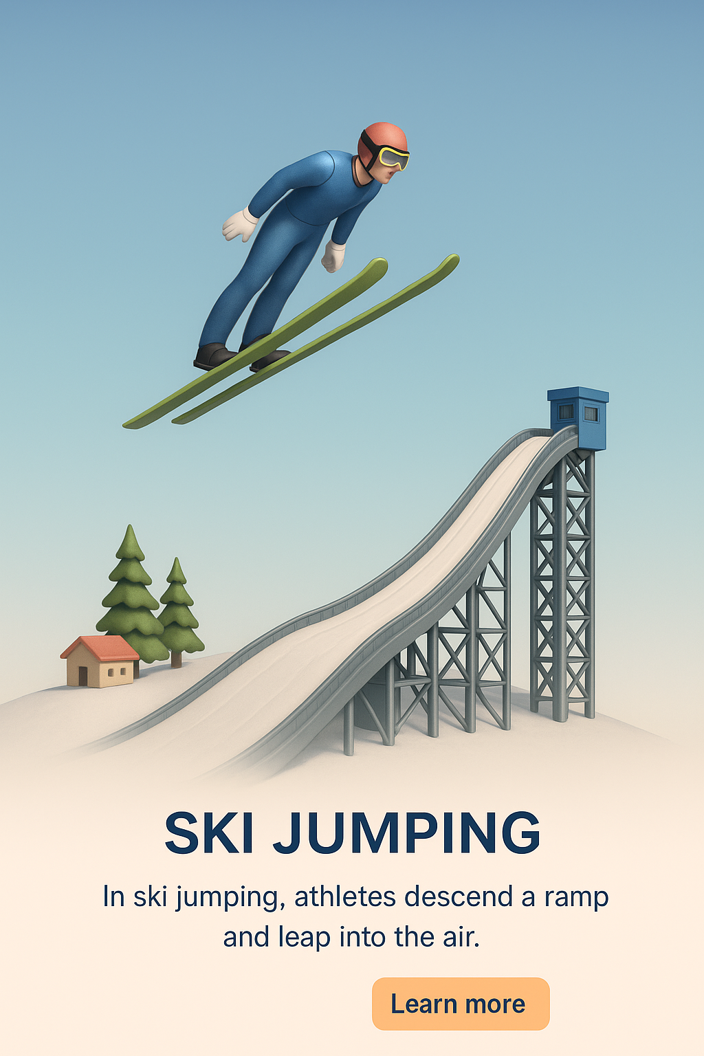 /Collection: /by davooda/Type: PNG/A detailed 3D illustration showcasing a ski jumper in action, soaring off a ramp. The background features a smooth gradient, with simple elements like trees and a ski jump structure.