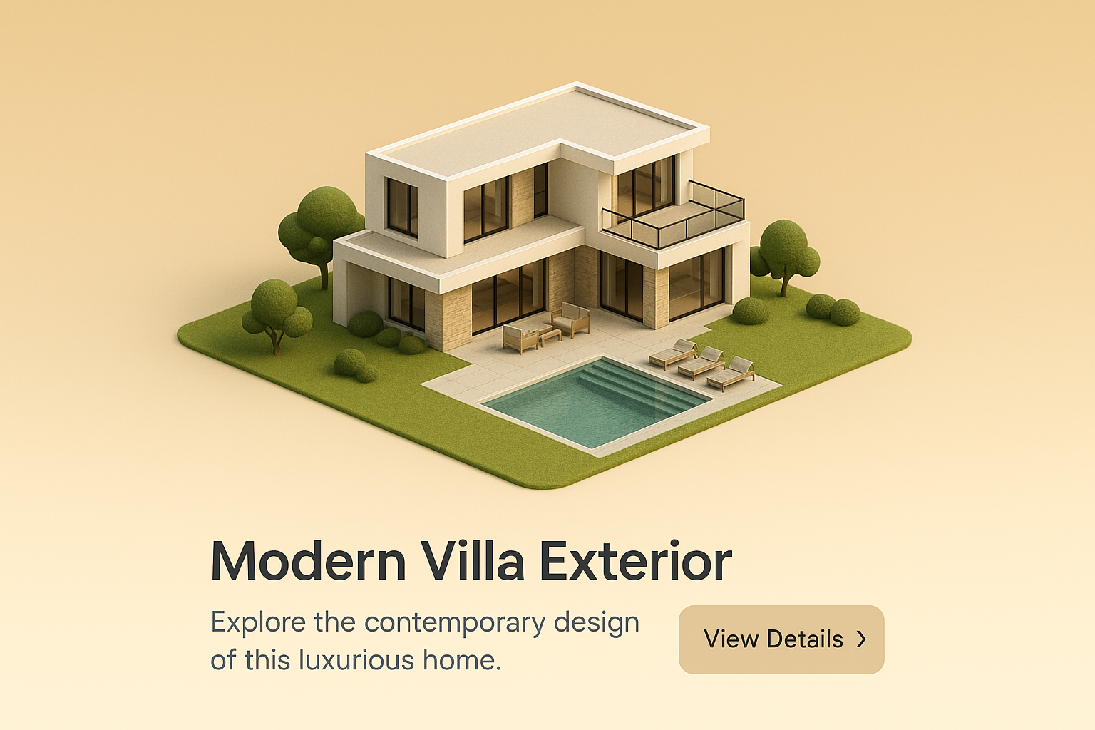 A beautifully rendered 3D scene of a luxurious modern villa, showcasing its elegant architecture and serene poolside environment. The villa is surrounded by greenery, set against a smooth gradient background.