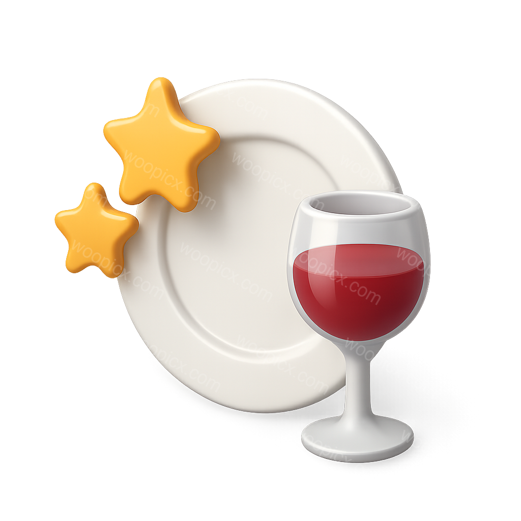 A stylized 3D icon featuring a white plate, a red wine glass, and two yellow stars. The design showcases a three-quarter view with a transparent background, emphasizing a volumetric and isometric style.
