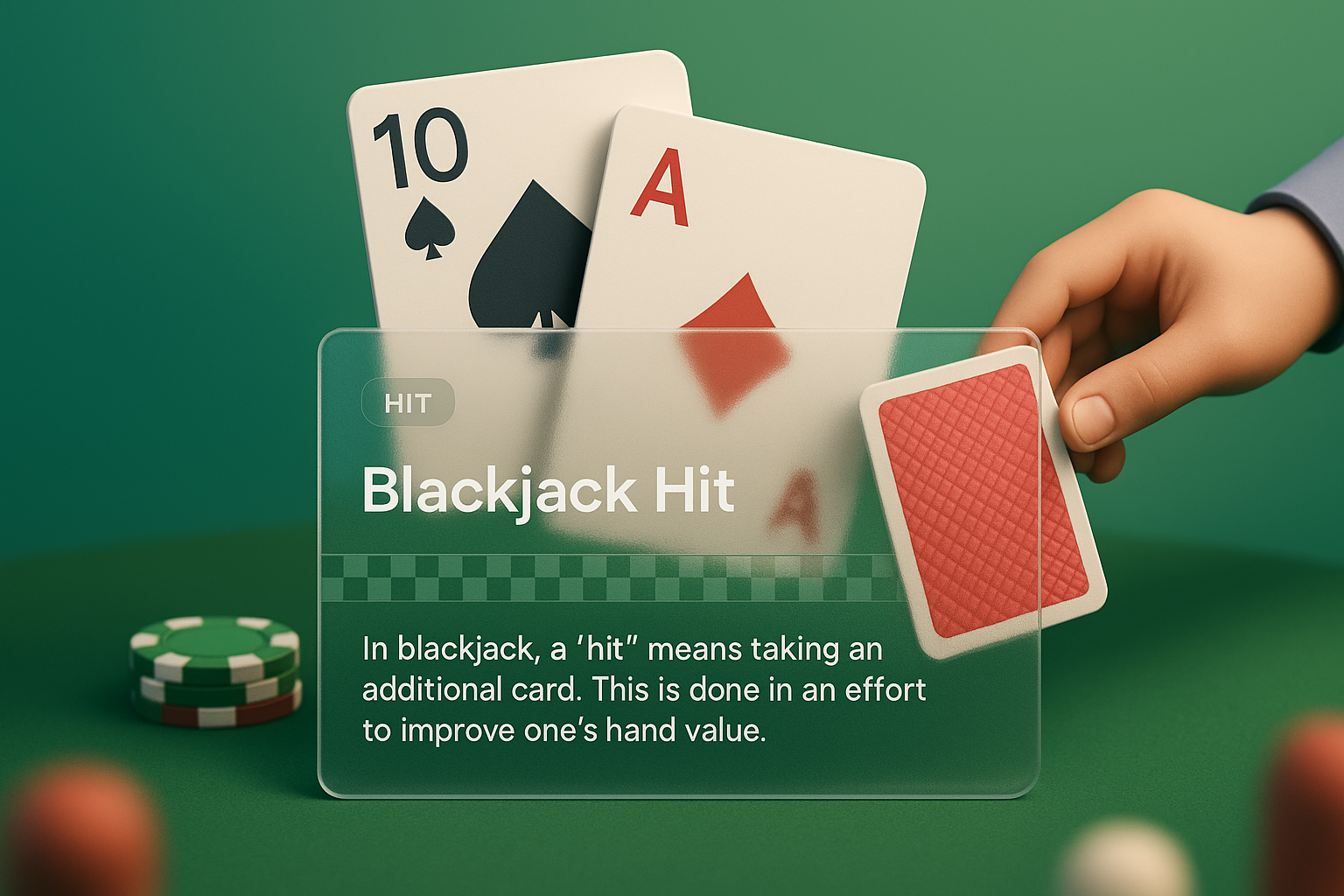/Collection: /by davooda/Type: PNG/A 3D depiction of a hand hitting in blackjack, featuring playing cards and chips. A stylish transparent block displays the definition of 'hit' with a patterned background.
