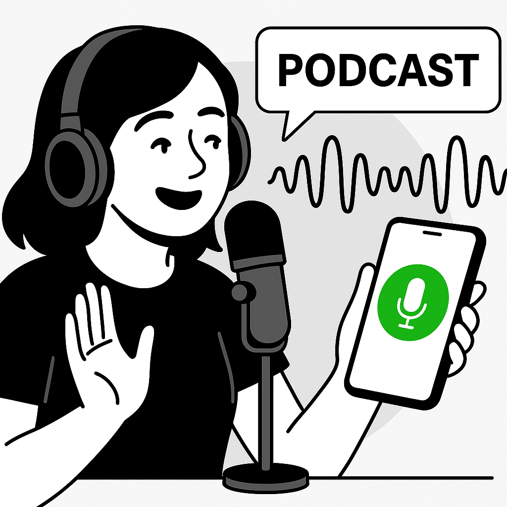 /Collection: /by davooda/Type: PNG/A modern digital illustration showing a podcaster speaking into a microphone while holding a smartphone. The design features clean lines and a monochromatic palette, ideal for podcast promotion or branding.
