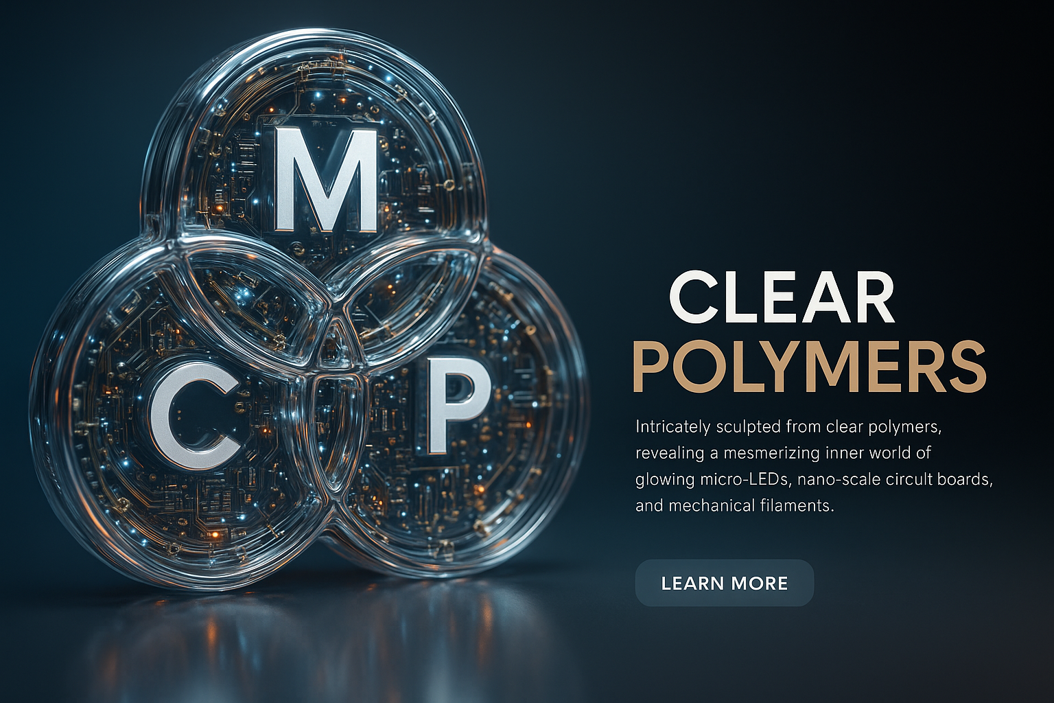 /Collection: /by davooda/Type: PNG/This image showcases three intersecting circles featuring the letters M, C, and P. The circles are made from clear, glass-like polymers, highlighting intricate internal designs with glowing micro-LEDs and fine mechanical components.
