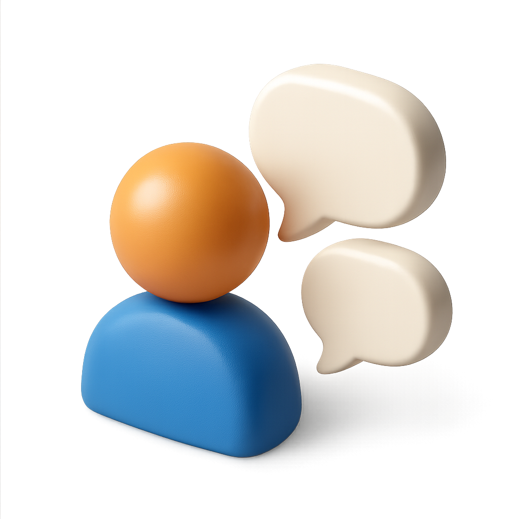 An isometric 3D icon featuring a person represented by a blue and orange figure, accompanied by two speech bubbles. The design has a volumetric feel and a transparent background.