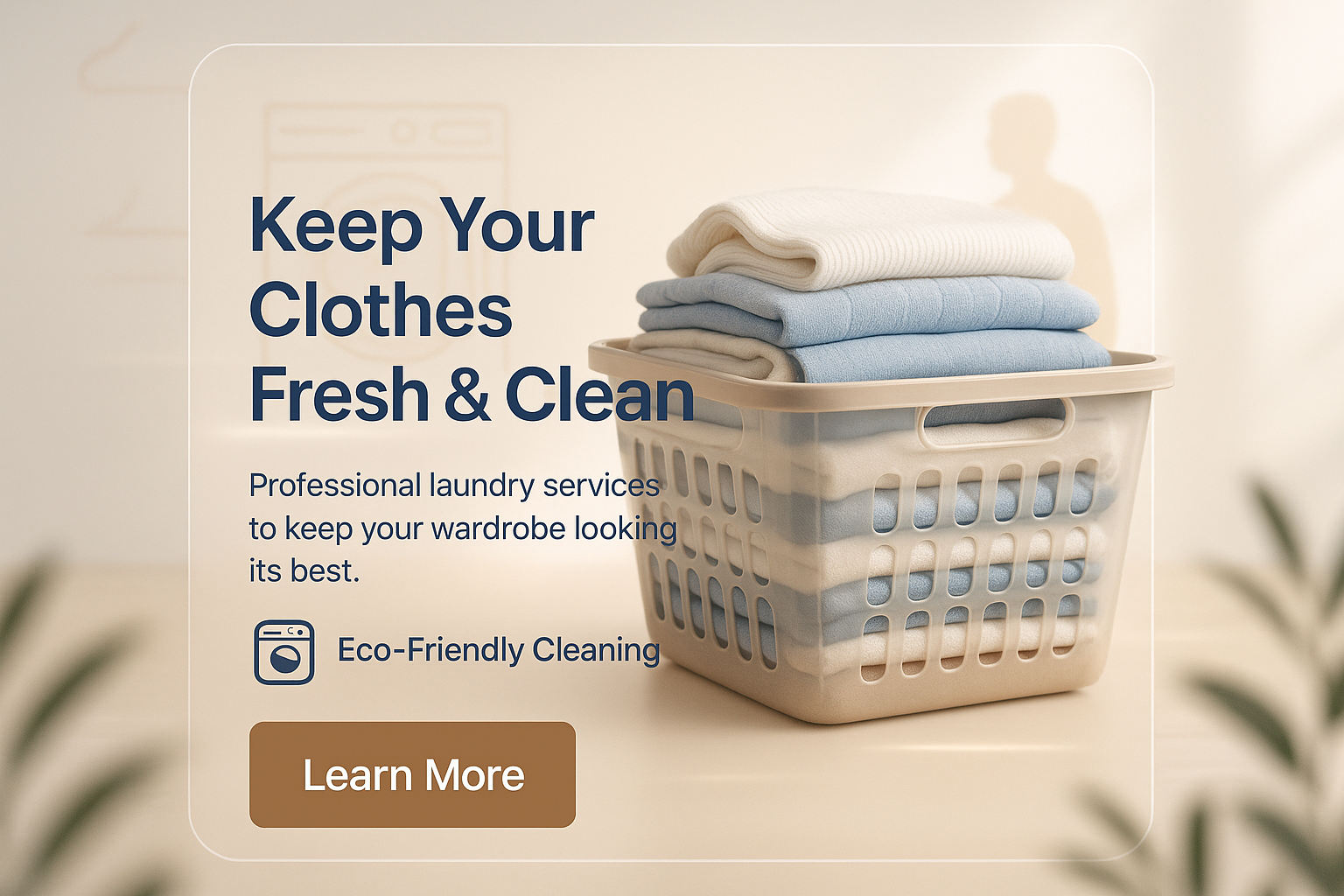 /Collection: /by davooda/Type: PNG/Modern promotional graphic showcasing a laundry service with an eco-friendly focus, featuring a neatly arranged basket of folded clothes. Ideal for digital marketing and service promotion.